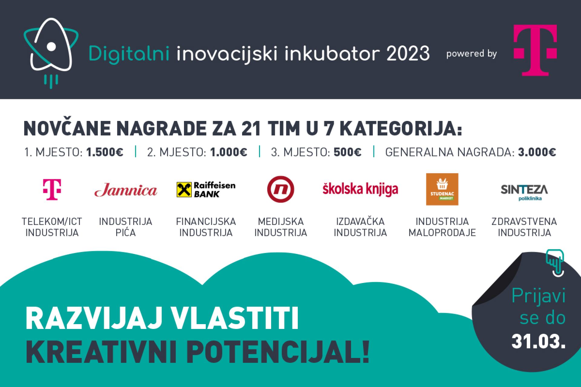 ➡ Ukoliko želite razvijati svoj kreativni potencijal i istražiti vlastite mogućnosti u novim izazovima, možete se prijaviti samostalno ili u timu do 31. 03. na poveznici: https://digitalniinkubator.eu/inovacijski/prijava/, a detalje pročitajte u dokumentu u privitku!