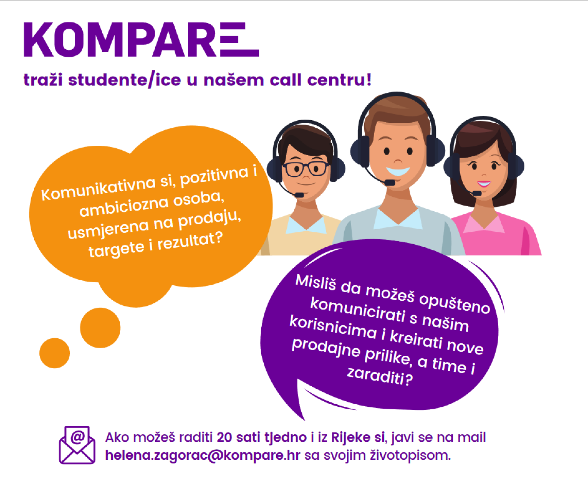 kompare.hr je poznata "ljubičasta stranica” na kojoj možeš usporediti, odabrati i kupiti za sebe najbolje osiguranje, internet, TV program i mobilne tarife. Surađujemo s 11 osiguravajućih kuća i 7 velikih telekom operatora, a uz pomoć i trud naših savjetnika nema više "sitnih slova” i obilaska poslovnica. Postojimo od 2012. godine i kontinuirano rastemo, kako raste i broj naših zadovoljnih kupaca. Trenutno nam za potrebe našeg odjela prodaje trebaju komunikativni/e i prodajno usmjeren/e STUDENTI/CE U CALL CENTRU Rijeka.