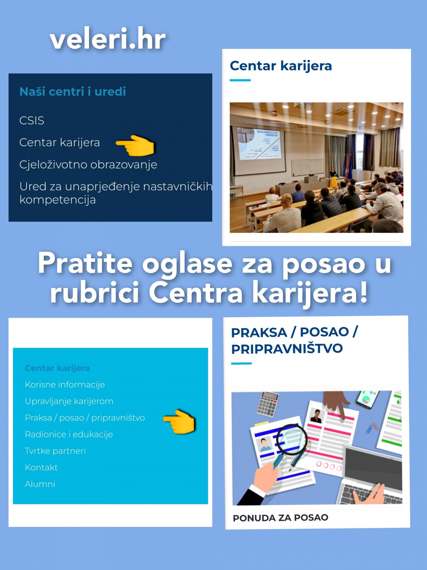 pozivamo vas da redovito pratite rubriku Centra karijera na našoj mrežnoj stranici te podrubriku pod nazivom Praksa/posao/pripravništvo. Centar karijera u toj rubrici objavljuje informacije o oglasima za posao, pripravništvo i praksu koji bi vam mogli biti korisni u vašoj karijeri, kako za vrijeme studiranja, tako i nakon završetka studija.