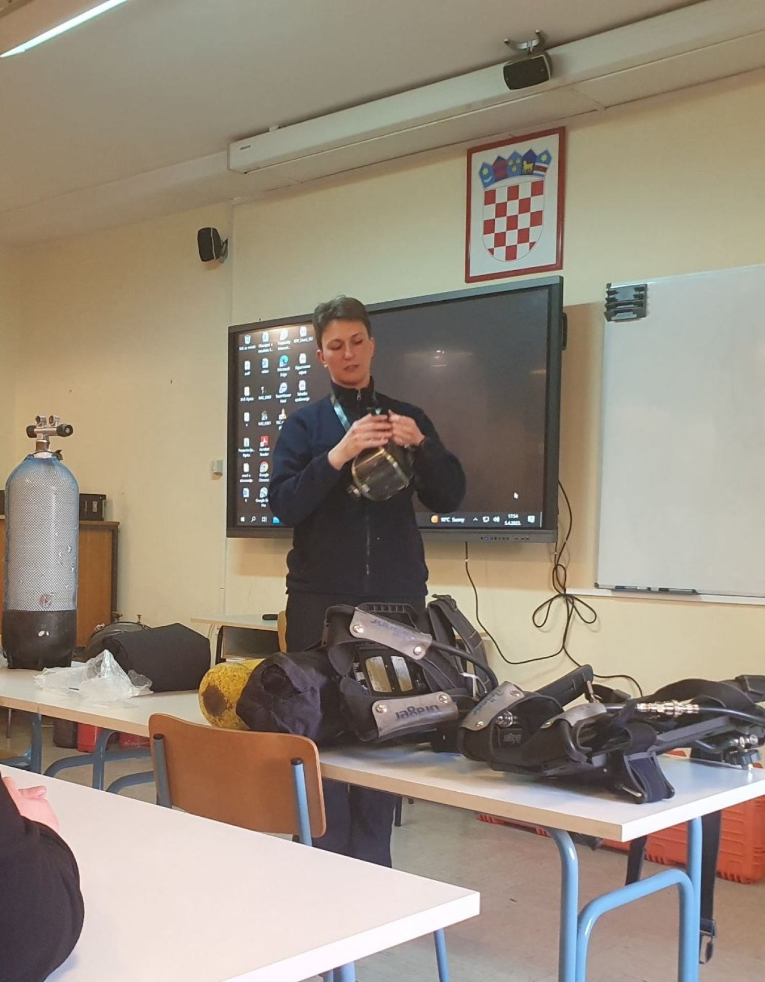 Prezentaciju osobne zaštitne opreme održali su pripadnici vatrogasne postrojbe, a podsjetimo se, Veleučilište u Rijeci je u ožujku 2021. godine potpisalo Sporazum o poslovnoj suradnji s Vatrogasnom zajednicom Primorsko-goranske županije, čime je studentima Odjela sigurnosti na radu omogućeno izvođenje stručne prakse, terenskih i praktičnih vježbi u prostorima Vatrogasne zajednice i na vatrogasnom poligonu u Šapjanama.
