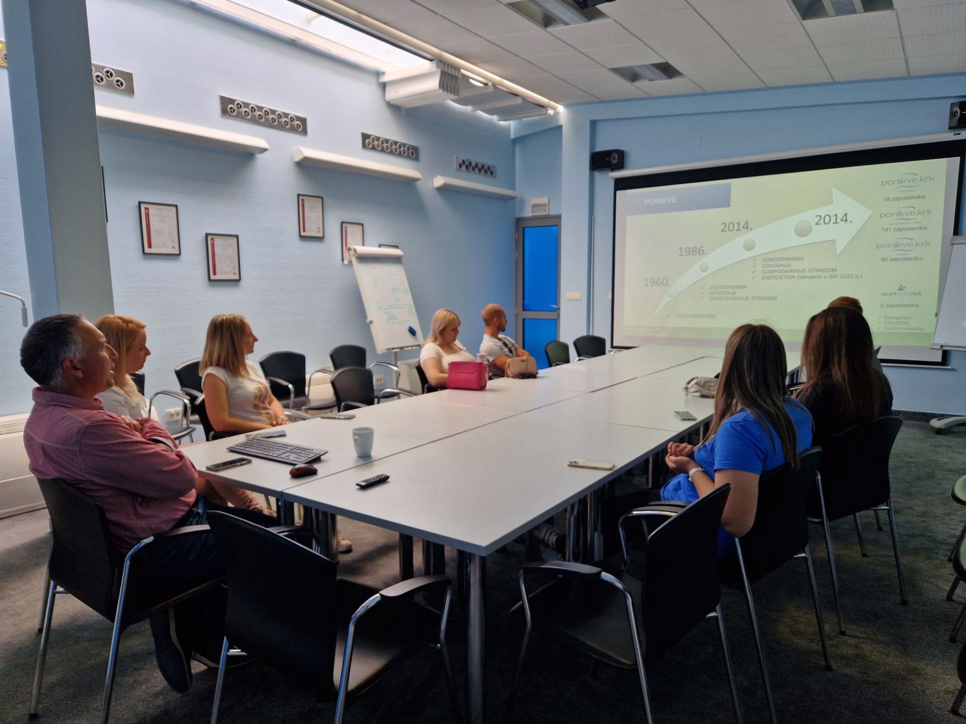 U upravnoj zgradi studentima je zamjenik direktora, gosp. Ivan Jurešić održao prezentaciju o djelatnosti tvrtke. Studenti su također pogledali edukacijski film o važnosti prikupljanja otpada. Nakon prezentacije i filma, studenti su u pratnji stručnjakinja zaštite na radu, gđe. Katarine Vrkić i gđe. Marijete Tavčar, koje su ujedno i naše studentice, posjetili dispečerski centar gdje se preko informatičkog sustava TELEMETRIJA vrši nadgledanje i kontrola vodoopskrbnoga sustava te mikrobiološki laboratorij gdje se vrši analiza vode.
